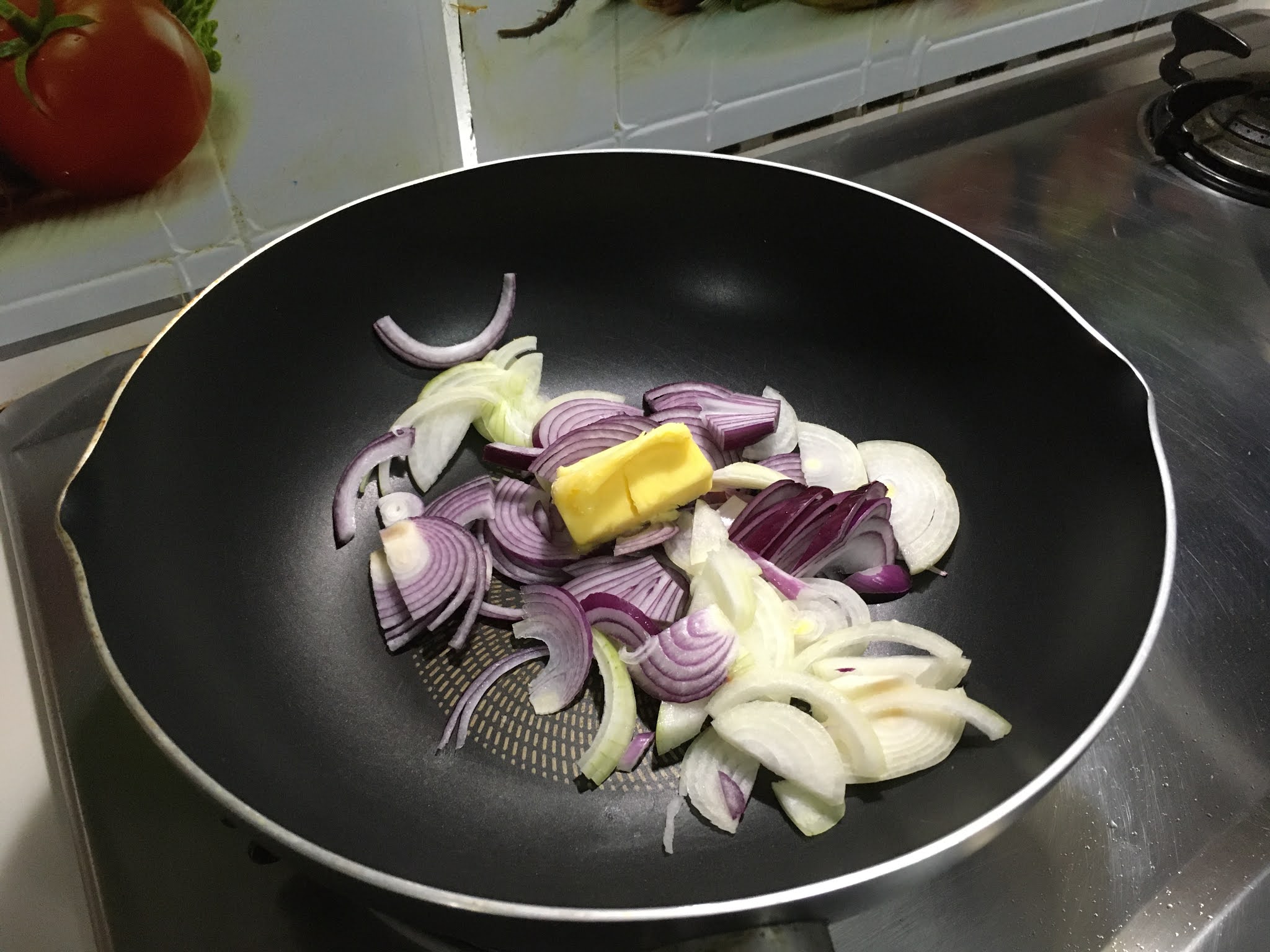 - Prepare the pan, add butter, red and yellow onion that you cut. Turn on the stove on medium-low flame. Saute for about 3 minutes